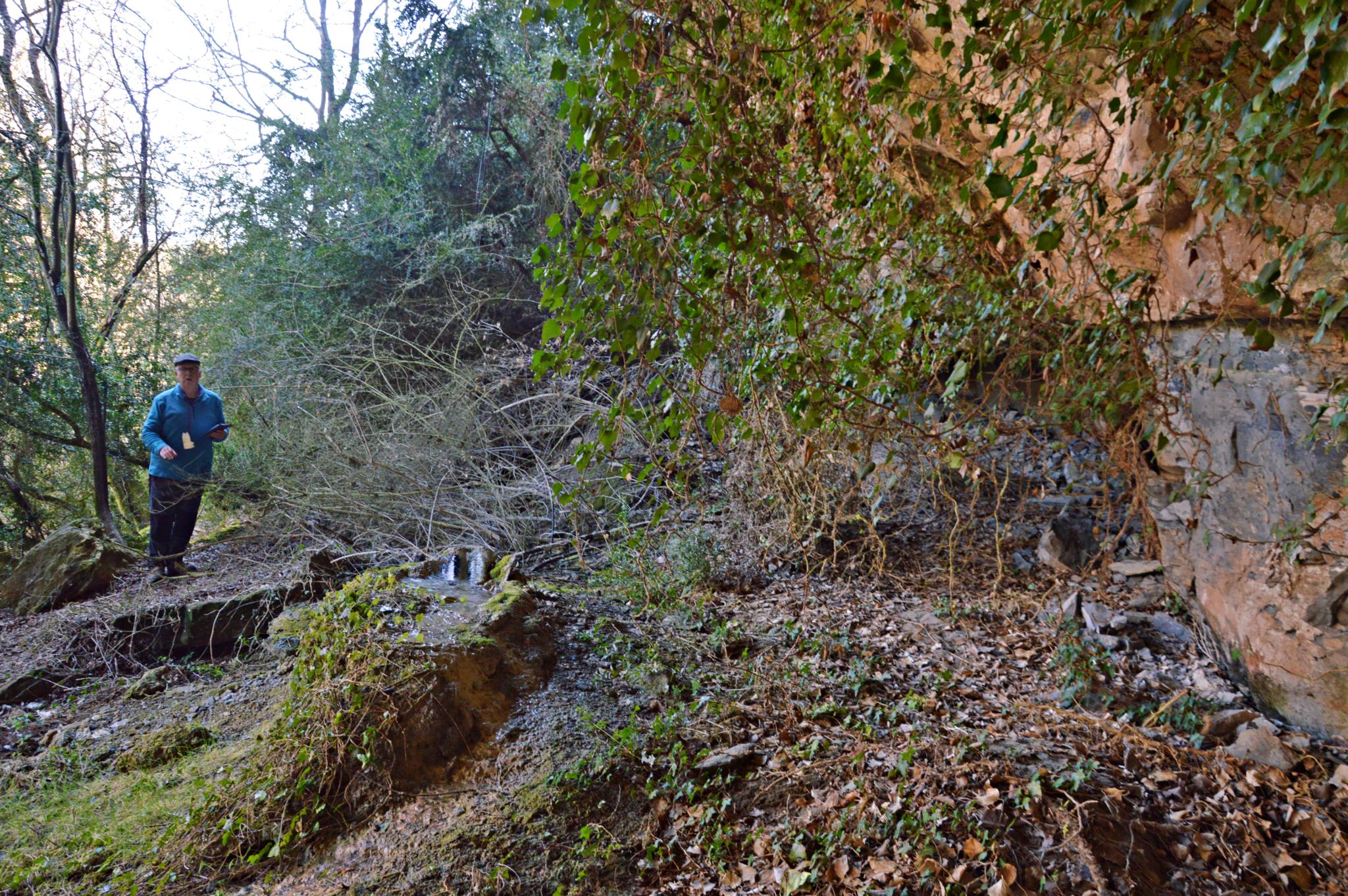 Continuarem per la pista ascendent uns 2km aproximadament, fins que trobem un eixamplament. Aquí deixarem el cotxe per agafar un corriol que baixa al llit de la riera de la Golarda. La balma la trobem a l’esquerra hidrogràfica, en unes parets de conglomerat.
